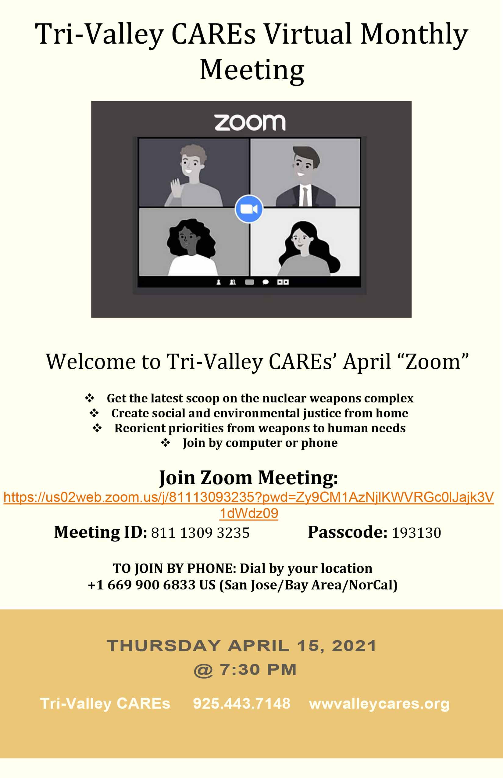 Tri-Valley CAREs’ would like to remind you of our monthly virtual meeting that will be held at 7:30 pm on Thursday April 15, 2021. Our monthly meetings are open to all interested members of the public. You will get up-to-the-minute reports on nuclear issues, and become part of a peace and justice community that is creating positive change locally, nationally and globally! Join us virtually!
