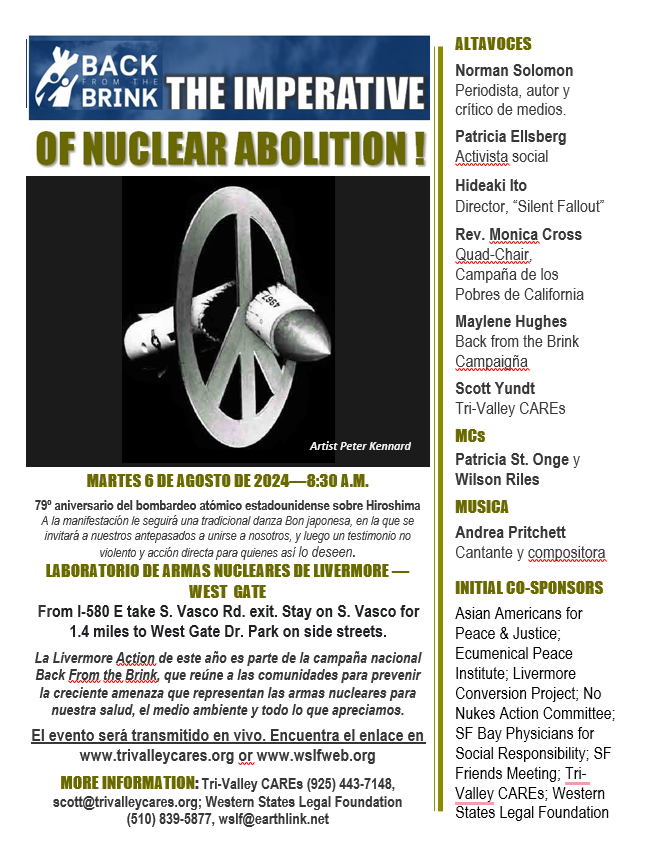 Alrededor de 100 personas se reunieron en la entrada Westgate del Laboratorio Livermore la mañana del martes 6 de agosto de 2024 para conmemorar el 79.º aniversario del bombardeo de Hiroshima. El tema del evento fue: De Regreso del Abismo: el imperativo de la abolición nuclear (Back from the Brink: the imperative of nuclear abolition). Una maravillosa lista de oradores brindó ideas y acciones convincentes para la audiencia comprometida. Estos oradores incluyeron a Maylene Hughes – Campaña Back from the Brink y Médicos por la Responsabilidad Social, Scott Yundt – Tri-Valley CAREs, Norman Solomon – periodista y autor, Patricia Ellsberg – activista social y esposa de Daniel Ellsberg, Hideaki Ito – director del documental película Silent Fallout y Reverenda Monica Cross – Campaña de los Pueblos Pobres de CA. Luego, los participantes fueron guiados a una tradición japonesa de Bon, realizando pasos de danza simbólicos en el camino para recordar a los casi un cuarto de millón de muertos hace 79 años. Por último, 23 personas participaron en desobediencia civil no violenta bloqueando la puerta del laboratorio después de que la policía emitiera el llamado de dispersión. Estos manifestantes fueron citados y puestos en libertad.