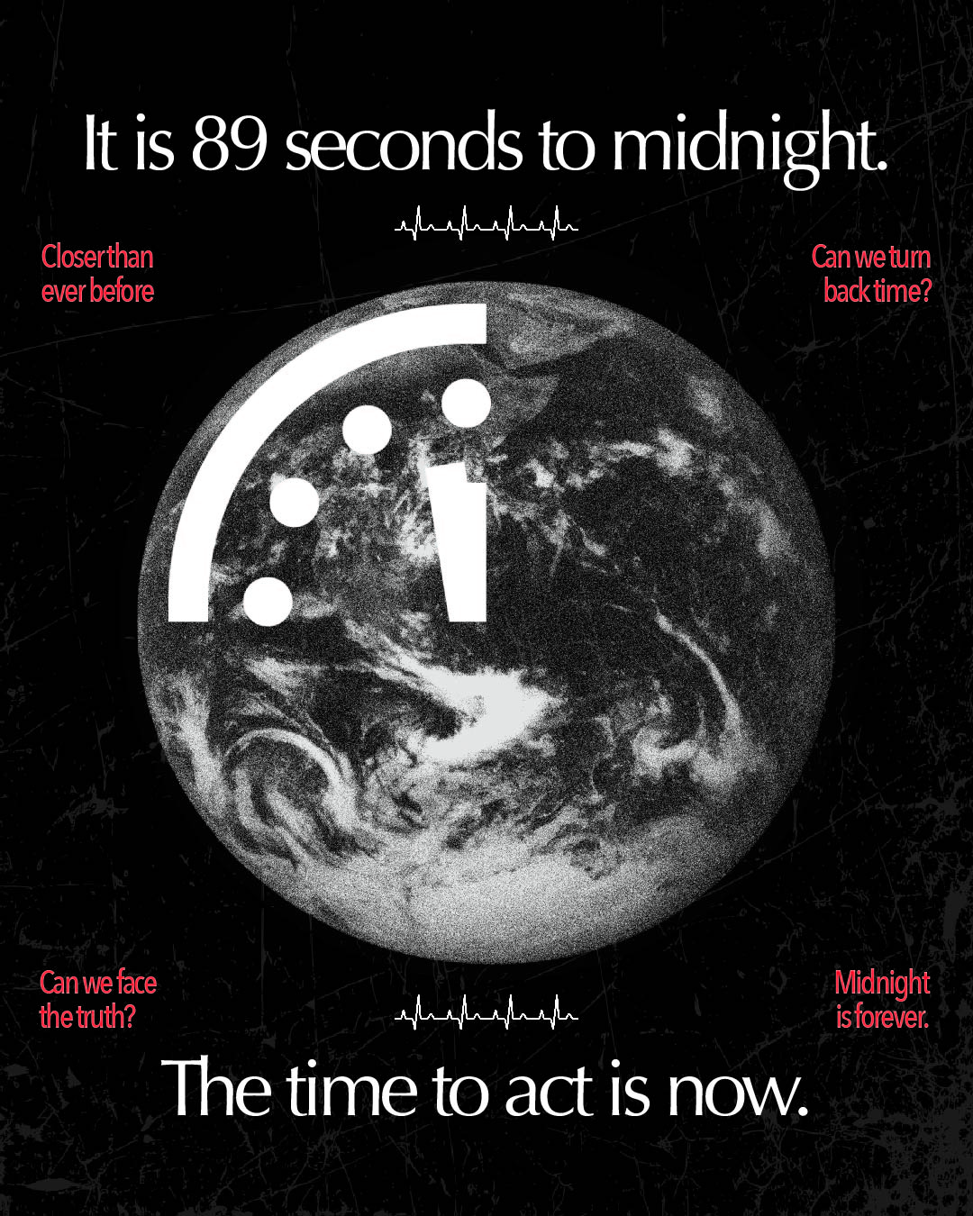 Today, the Bulletin of the Atomic Scientist revealed that the Doomsday Clock ticked down to 89 seconds, from the 90 seconds it has been at for the past several years. The clock’s hand leaves only a sliver of time until midnight; a metaphor for the impending self-destruction of humanity by technological advancement.