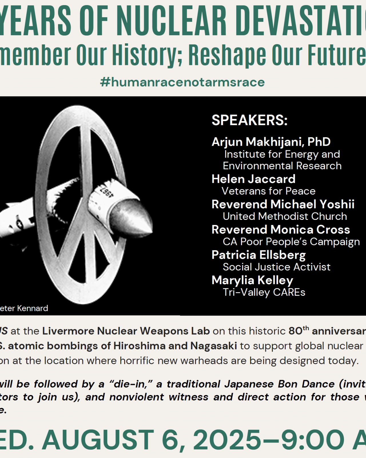 Tri-Valley CAREs is responding to the moment by working tirelessly to oppose dangerous nuclear policies at home and promote the abolition of nuclear weapons locally and globally. And, along with allied groups in the Bay Area, we are putting the final touches on a powerful 80th anniversary commemoration that will take place in front of the Livermore Lab West Gate.