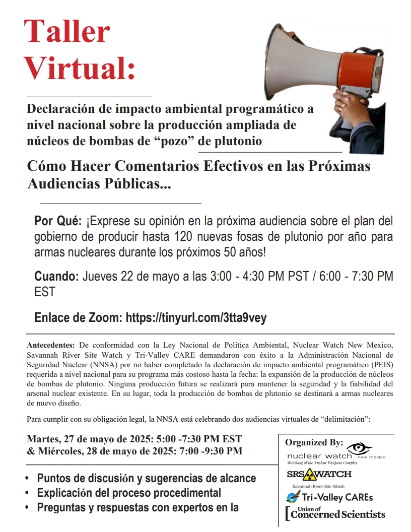 De conformidad con la Ley Nacional de Política Ambiental, Nuclear Watch New Mexico, Savannah River Site Watch y Tri-Valley CARE demandaron con éxito a la Administración Nacional de Seguridad Nuclear (NNSA) por no haber completado la declaración de impacto ambiental programático (PEIS) requerida a nivel nacional para su programa más costoso hasta la fecha: la expansión de la producción de núcleos de bombas de plutonio. Ninguna producción futura se realizará para mantener la seguridad y la fiabilidad del arsenal nuclear existente. En su lugar, toda la producción de bombas de plutonio se destinará a armas nucleares de nuevo diseño.