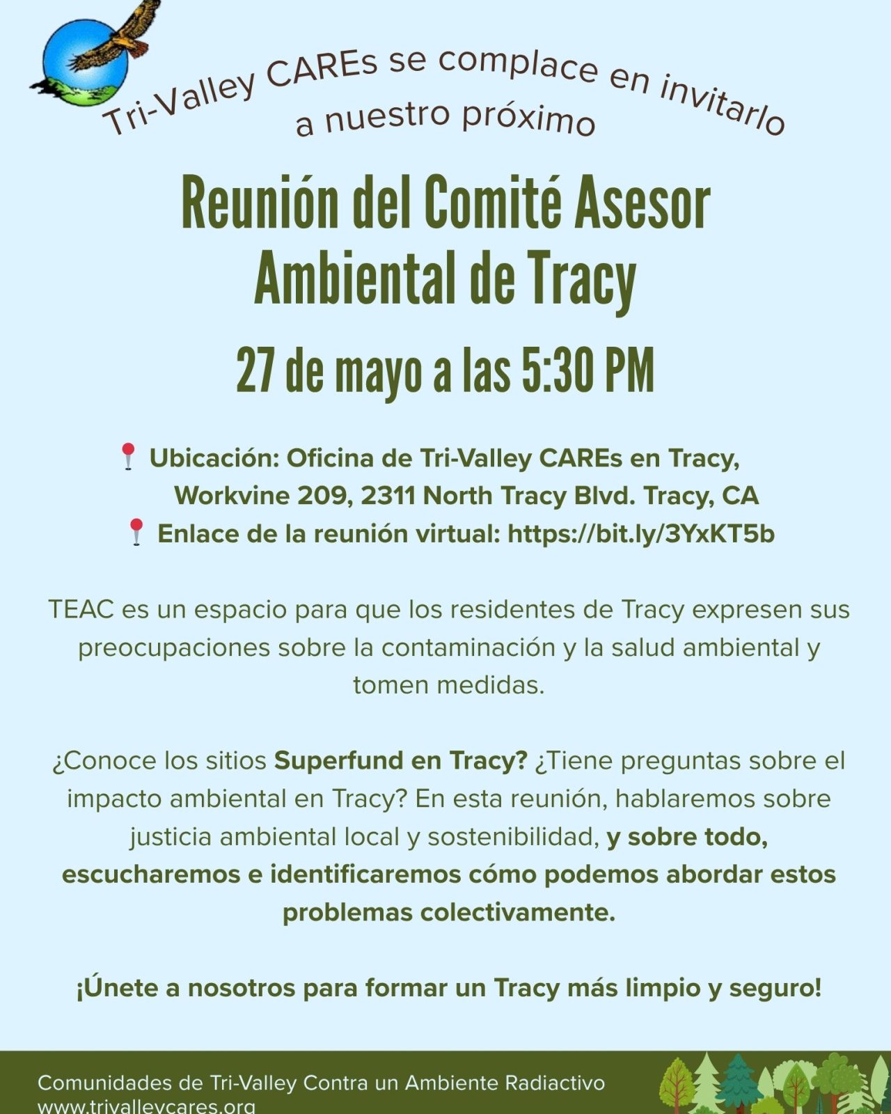 Reunión del Comité Asesor Ambiental de Tracy: 27 de mayo a las 5:30 p. m. Tri-Valley CAREs se complace en invitarlo a nuestra próxima reunión “Comunidades de Tri-Valley Contra un Entorno Radiactivo” (www.trivalleycares.org).