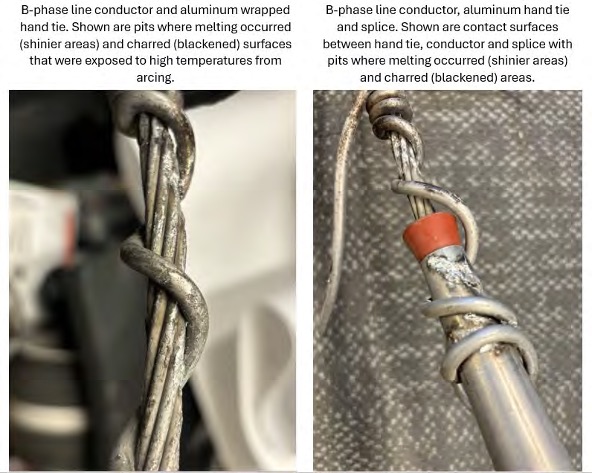 - The fire ignited near pole 8009 when an aluminum hand tie failed, allowing two power lines to come into contact.