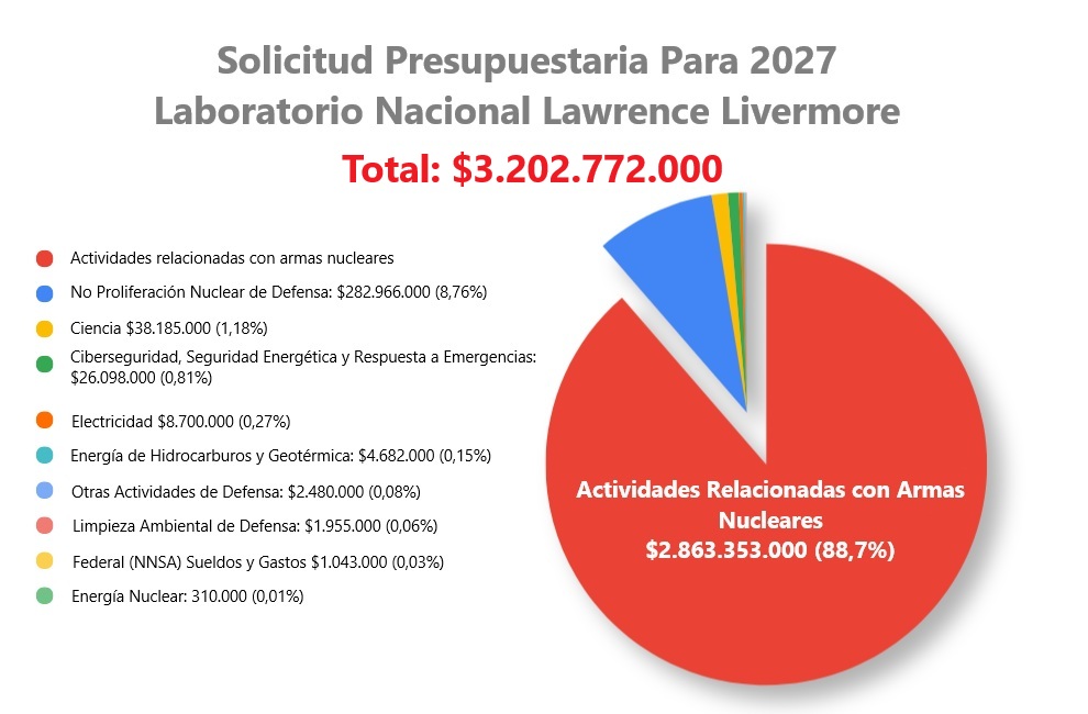 Ya se trate de núcleos de plutonio (*pits*), etapas secundarias de uranio, altos explosivos o tritio y otros “combustibles de defensa”, ¡el presupuesto del Laboratorio para la “modernización de la producción” de armas nucleares ha crecido un 106% en los últimos dos años! Por ejemplo, el LLNL es el laboratorio líder en el diseño de la ojiva W87-1, la cual irá montada en la parte superior del nuevo misil balístico intercontinental Sentinel. La W87-1 requerirá núcleos de plutonio totalmente nuevos, cuya producción acaparará al menos los primeros 10 años de la capacidad de fabricación de núcleos en el Laboratorio Nacional de Los Álamos.