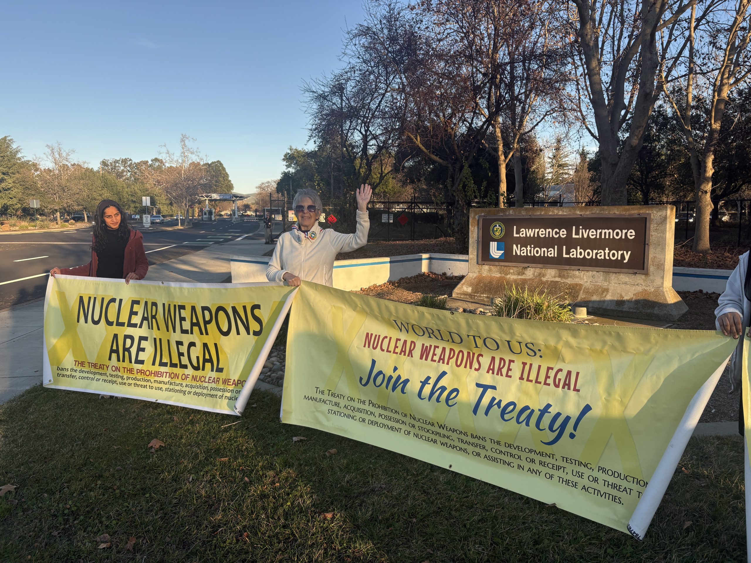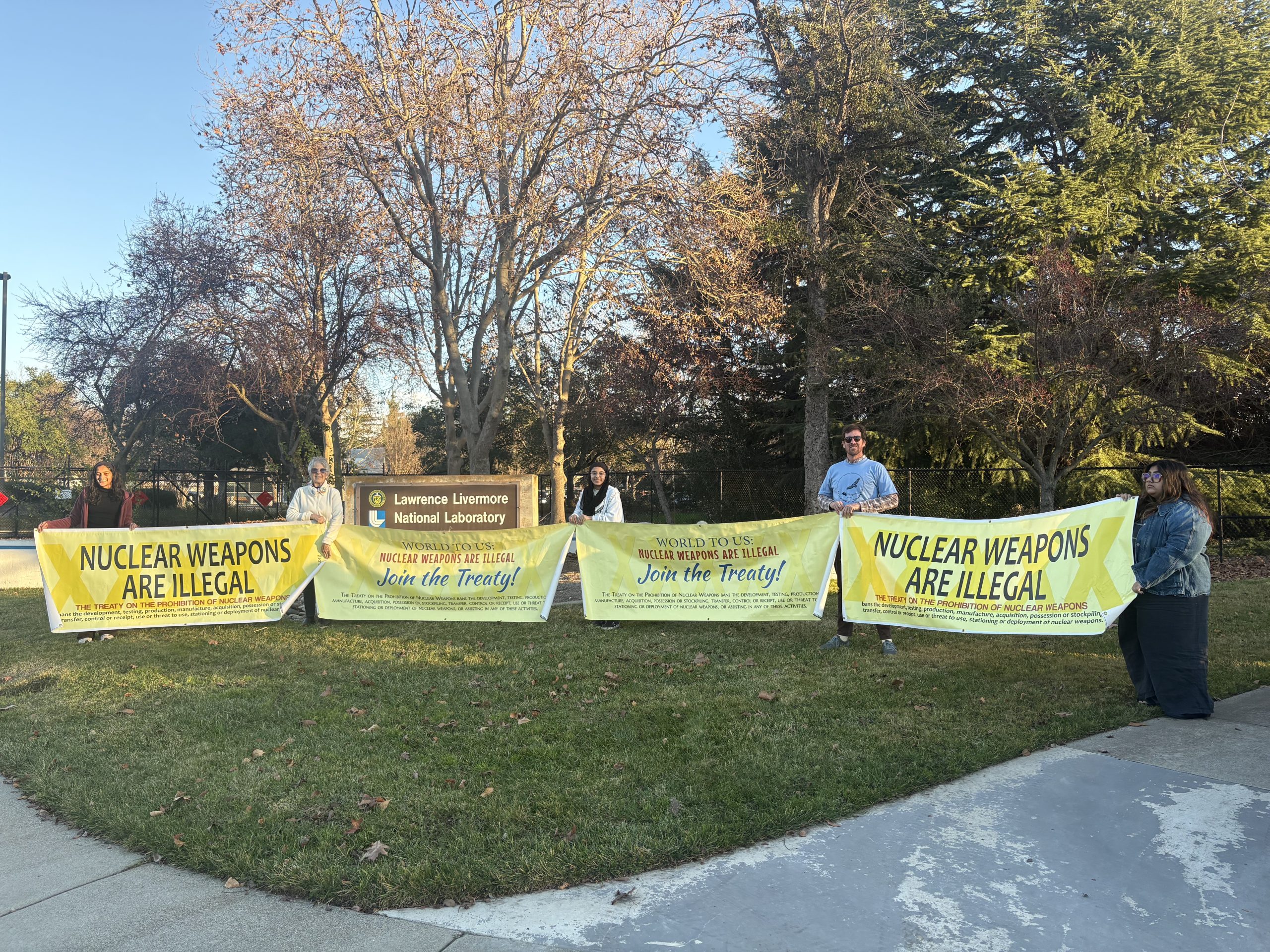 Colocamos pancartas de 2,4 metros en el césped frente al laboratorio de armas nucleares, donde trabajadores y otras personas leyeron los mensajes positivos. ¡Incluso recibimos bocinazos de apoyo de los conductores! También leímos extractos del Tratado y hablamos sobre sus impactos y la importancia del día.