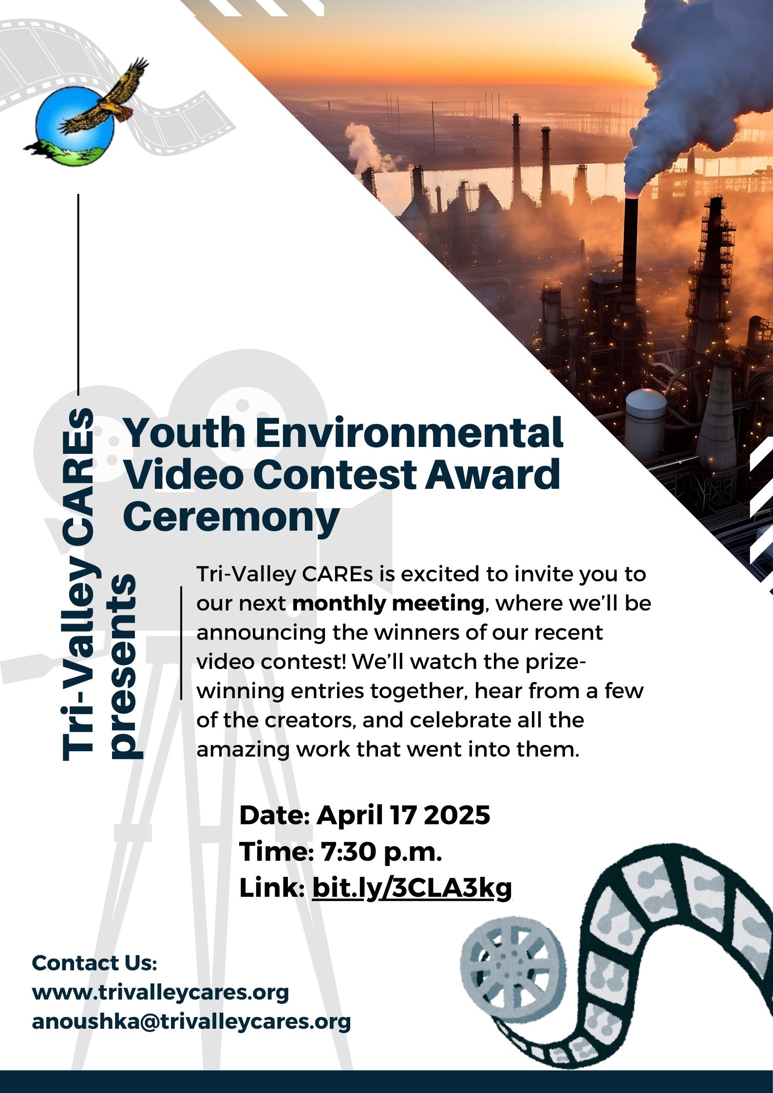 Tri-Valley CAREs is pleased to invite you to our next monthly meeting, where we will announce the winners of our recent video contest. We will watch the award-winning entries together, hear from some of the creators, and celebrate their incredible work.