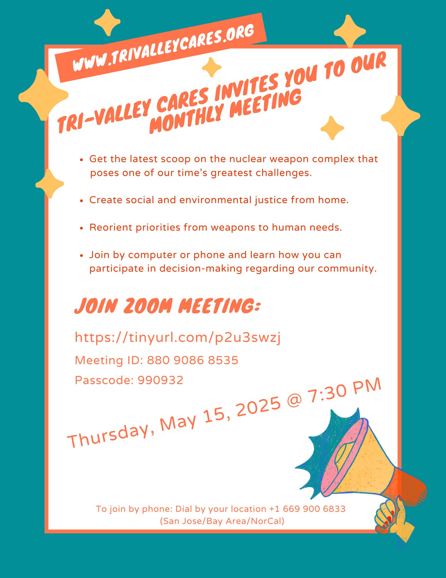 Tri-Valley CAREs’ would like to remind you of our monthly virtual meeting that will be held at 7:30 pm on Thursday, May 15, 2025. Our monthly meetings are open to all interested members of the public. You will get up-to-the-minute reports on nuclear issues, and become part of a peace and justice community that is creating positive change locally, nationally and globally! Join us virtually!